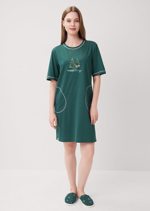 Платье для дома и отдыха прямого силуэта из хлопкового трикотажного полотна. Короткий втачной рукав. Округлая горловина с обтачкой. Боковые карманы. Обтачка горловины, низ рукава и карманы с застилом. Боковой разрез. Спереди принт.