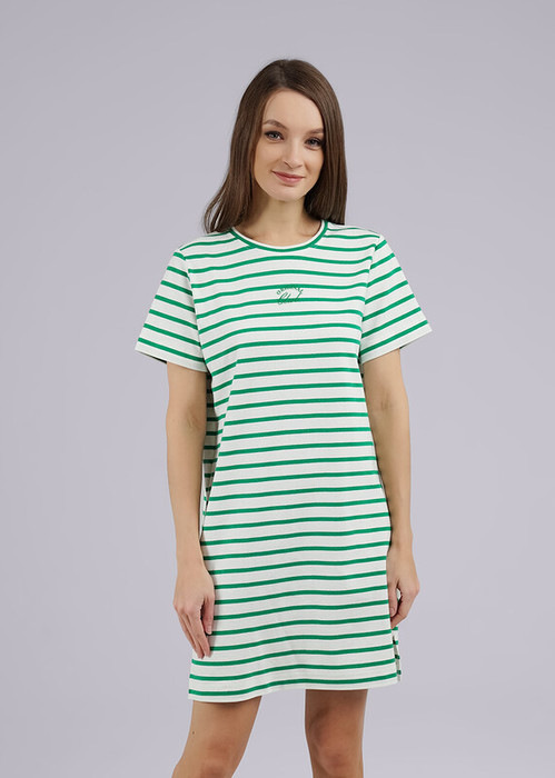 Платье для дома из трикотажного полотна рибана. Прямого силуэта, короткий втачной рукав. По бокам разрезы. На детали переда принт. Округлая горловина с обтачкой из рибаны.