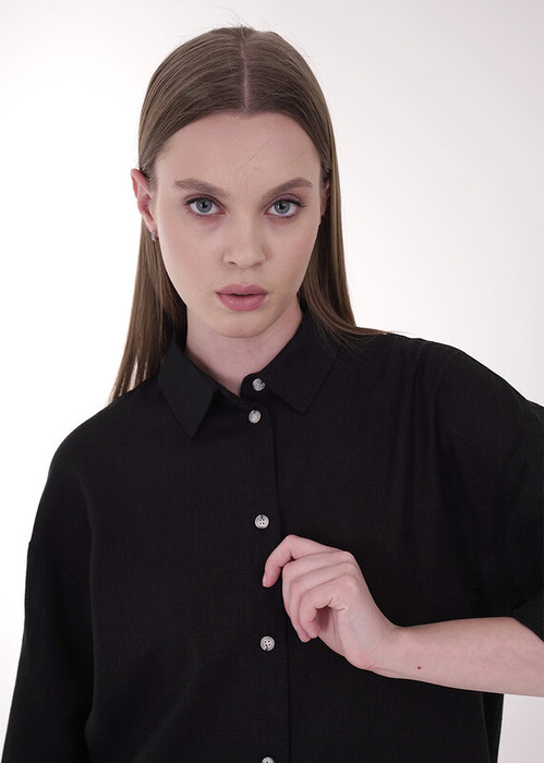 Блузка из текстильного полотна лен с вискозой,прямого силуэта. Длинный рукав со спущенной линией плеча, по низу манжет с разрезом. По борту цельновыкроенная планка с застежкой на пуговицы, по горловине отложной воротник со стойкой. По бокам разрезы.