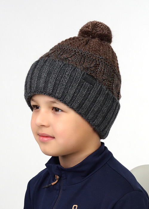 Детская вязаная шапка для мальчика выполнена комбинированием однотонной и скрученной пряжи. Дополнительное утепление - меховой подклад (мех на трикотажной основе). Декорирована ниточным помпоном и нашивкой логотип. Идеально подходит для зимы.