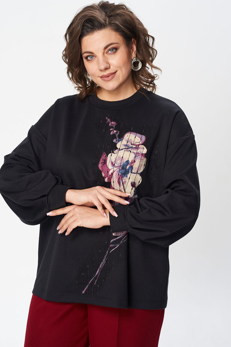 Джемпер свободного силуэта из трикотажной ткани с принтом. Рукав втачной одношовный со складками по низу и манжетой. Горловина обработана планкой. По переду поверх принта настрочена сетка с бархатным рисунком. Длина джемпера - 66 см, длина рукава джемпера - 53 см.