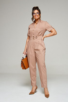 Комбинезон полуприлегающего силуэта. Комбинезон отрезной по линии талии. Лиф переда и спинки с рельефами. В среднем шве спинки вставлена потайная тесьма-«молния». Брюки длинные, широкие. По задним половинам брюк талиевые вытачки. По передним половинам односторонние складки. В боковые швы вставлены отлетные детали, которые переходят в завязки вокруг шей.