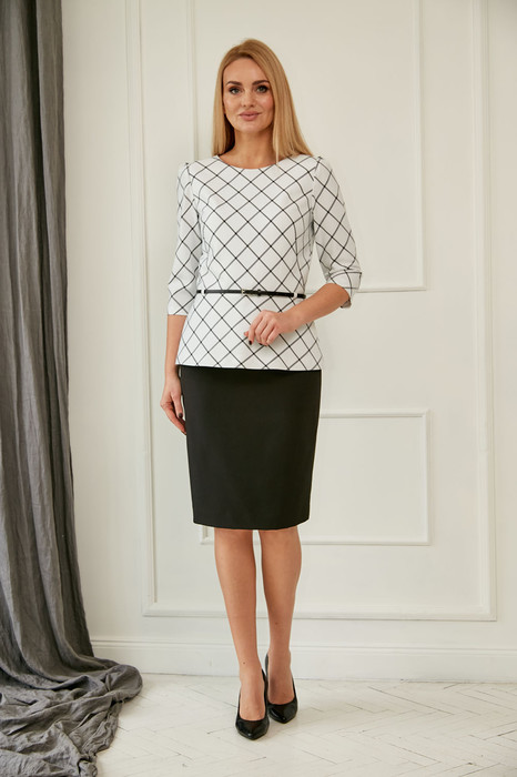 Комплект женский состоящий из блузки и юбки. Блузка прилегающего силуэта, отрезная по линии талии, вырез горловины-круглый, рукав 3/4 со складками по окату, застежка по спинке на пуговицы, изделие на подкладке, со съемным посом. Юбка прямая, зауженная к низу, на обтачке, застежка сзади на молнию, в среднем шве заднего полотнища-шлица, изделие на подкладке.