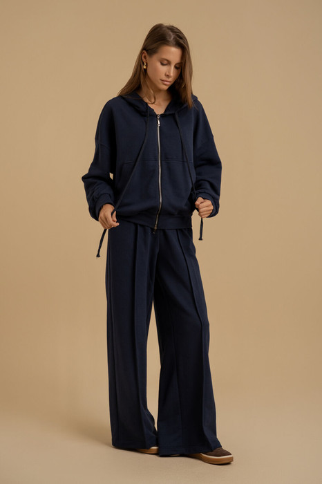 Комплект женский двухпредметный из трикотажного полотна футер. Джемпер достаточно объемной формы. Вырез горловины оформлен капюшоном. Рукава - втачные со спущенной проймой. Застежка - молния. Спереди - настрочные карманы. Низа - с отрезными планками с оттяжкой. Брюки - свободного покроя. Пояс - отрезной фигурной формы, с эластичной тесьмой. В боковых швах имеются карманы. Спереди застрочены стрелки.