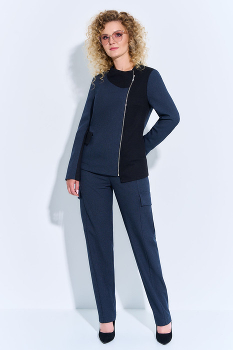 Костюм женский  2х предметный. Жакет полуприлегающего кроя, ассиметричный , на полочке расположен накладной карман с клапаном.  Горловина -прилегающая стойка. Рукав втачной длинный. Брюки зауженные к низу на притачном поясе с резинкой.  на уровне колена симметрично настрочены накладные карманы. Застежка  молния на гульфике.