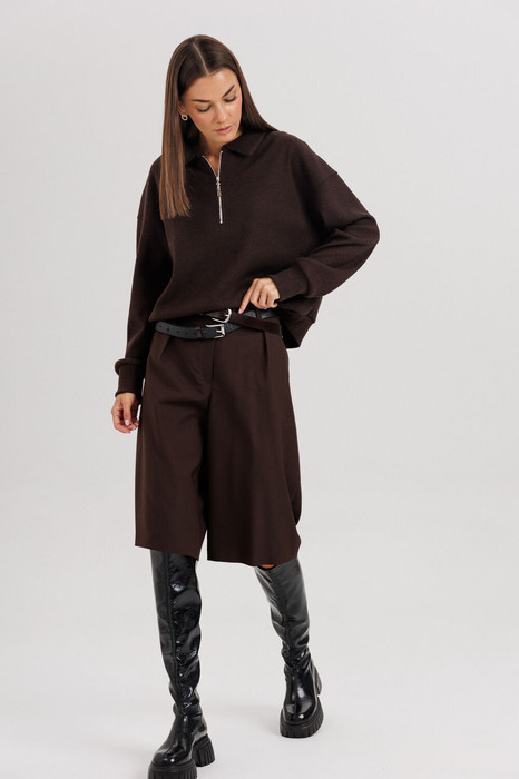 Джемпер из трикотажа. Это одна из базовых вещей осенне-зимнего сезона. Он тёплый, удобный и невероятно комфортный. К тому же, настолько универсален, что его можно стилизовать абсолютно разными способами. Свободный покрой с заниженной линией плеча, рукав рубашечного покроя на отрезной манжете, воротник классический, по центру полочки частичная застёжка-молния. По низу джемпера - отрезной пояс. Бриджи классические, прямые, на отрезном поясе со шлевками, эластичном в области спинки. Передние половинки с талиевыми вытачками и наклонными боковыми карманами.