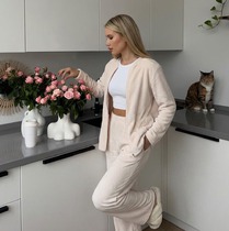 Костюм молодежный из гладкокрашенного тканого полотна «велсофт», состоящий из куртки и брюк. Куртка - прямого силуэта, с длинными втачными рукавами, без воротника с горловиной овальной формы, центральной бортовой застежкой на тесьму «молния». На левой полочке на подгибке, настрочен декоративный элемент.Брюки – длинные, свободные, с карманами в боковых швах и с эластичной тесьмой по талии.