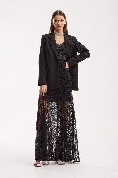 Юбка по силуэтной форме – «годе от уровня колена». Выполнена из кружевного полотна с прямой подкладкой длины «мини». Длина самой юбки – «макси». Верхний срез обработан поясом. Юбка состоит из центральных, боковых частей переда и спинки, а так же клиньев, вставленных в рельефы по переду и по спинке. .На заднем полотнище расположен средний шов с застежкой на «тесьму-молнию».