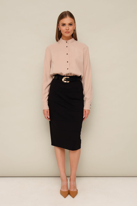 Юбка-карандаш с посадкой на талии и горизонтальными подрезами по переду. Обтачной пояс, застежка на потайную тесьму-молнию в среднем шве спинки. Для удобства движения сзади обработана шлица. В юбке предусмотрены шлевки.