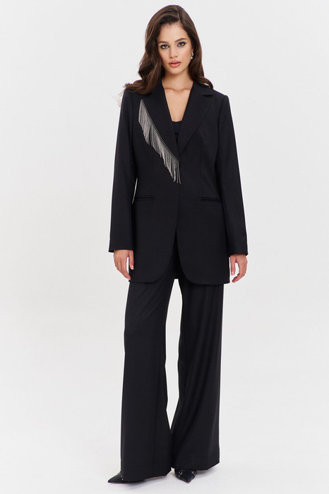 Костюм, состоящий из жакета и брюк. Жакет полуприлегающего силуэта, длиной ниже линии бедер. Спинка со средним швом, в котором обработана шлица, с рельефами от пройм до низа. Перед с нагрудной вытачкой, рельефом и прорезным карманом «в рамку». Рукава двушовные, втачные, длинные. Воротник пиджачного типа с лацканом. Правый лацкан декорирован отделочной тесьмой. Застежка на петлю и пуговицу. Жакет на подкладке. Брюки прямого силуэта, на притачном поясе с резинкой по спинке. По задним половинкам талиевые вытачки. По передним половинкам обработаны боковые карманы с наклонным входом, и застежка на тесьму-«молнию» с гульфиком и откоском. По поясу застежка на петлю и пуговицу.