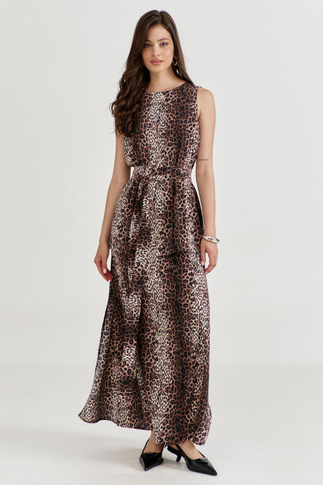 Комплект женский, состоящий из блузки и юбки. Блузка свободного кроя, длиной ниже линии бедер. Спинка со средним швом, в котором по горловине обработана застежка на навесную петлю и пуговицу. По переду нагрудные вытачки. Блузка без рукавов. Горловина округлой формы. Блузку дополняет съемный пояс. Юбка А-образного силуэта, длиной до щиколотки. Юбка по задним полотнищам с талиевыми вытачками. В боковых швах обработаны разрезы. В левом боковом шве обработана застежка на потайную тесьму-«молнию».