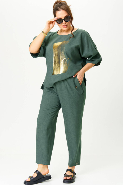 На блузоне выполнена печать фольгой. Брюки с функциональными карманами, пояс на резинке.