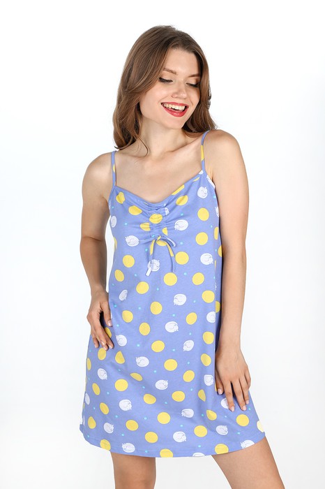 Сорочка молодежная из трикотажного полотна «кулирка» с набивным рисунком, на тонких бретелях, слегка расширенная книзу. По центру горловины переда настрочена кулиса с двумя продетыми завязками, позволяющими регулировать величину сборки.
