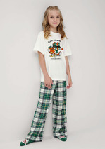Пижама для мальчика, состоящая из футболки и брюк. Футболка - из гладкокрашеного трикотажного полотна "кулирка", классического покроя: с короткими втачными рукавами, горловиной овальной формы, обработанной втачной планкой и принтом в центре переда, выполненным в технике шелкографии. Брюки - из трикотажного полотна "кулирка" в клетку, длинные, с эластичной тесьмой на поясе и притачными манжетами из полотна "кашкорсе" черного цвета.
