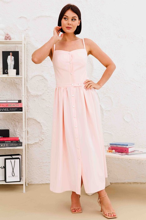 Платье в длине миди. застежка - пуговицы по центру переда. в обалсти талии обработана планка с пуговицей. лиф обработан бретеляи. юбка обработана мелкой сборкой.
