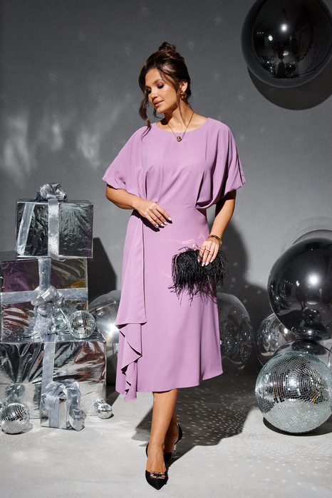 Конструкция верхней части платья выполнена в свободном стиле со спущенной линией плеча и глубокими складками на линии талии спереди.