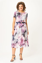 Силуэт свободный, расширенный, покрой - цельнокроенный, застёжка центральная на пуговицы. Полочки с накладными большими карманами, спинка с отрезной кокеткой, цельнокроенной с рукавом, и средним швом. По боковым швам - разрезы. Кокетка полочки и спинки из отделочной ткани. Длина платья около 105 см. Длина рукава с плечом около 40 см.