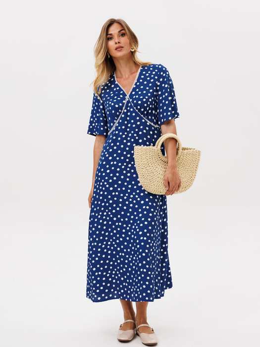 Платье А-образного силуэта выполнено из легкой вискозной ткани. Перед с V-образным вырезом и подрезами. В подрезах и вдоль горловины вставлено кружево. В районе груди в подрезах сборка. Рукав втачной расширенный книзу. Спинка со средним швом. Длина платья - 125 см, длина рукава - 30 см.