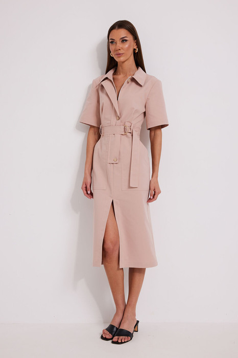 Платье выполнено из джинсовой ткани, полуприлегающего силуэта, с застежкой на отделочную молнию и планку, с тремя петлями-пуговицами. Платье с отрезной деталью в области линии талии, в которую вставлены шлевки и протягивается пояс с полукольцами. Спина с кокеткой встречной складкой по центру на талии. По переду складки в области груди, в нижней части накладные карманы. По центру переда разрез. Горловина оформлена стояче-отложным воротником. Рукав втачной, короткий.