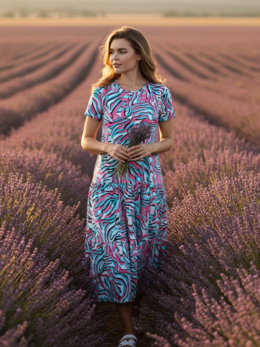 Платье из трикотажного полотна «кулирка» с набивным рисунком, с короткими втачными рукавами, горловиной фигурной формы (сзади V- образная, спереди – овальная), с двумя завязывающимися концам, являющимися продолжением окантовки горловины переда. Юбка – широкая отрезная по линии бедер из двух ярусов, верхний срез присборен.