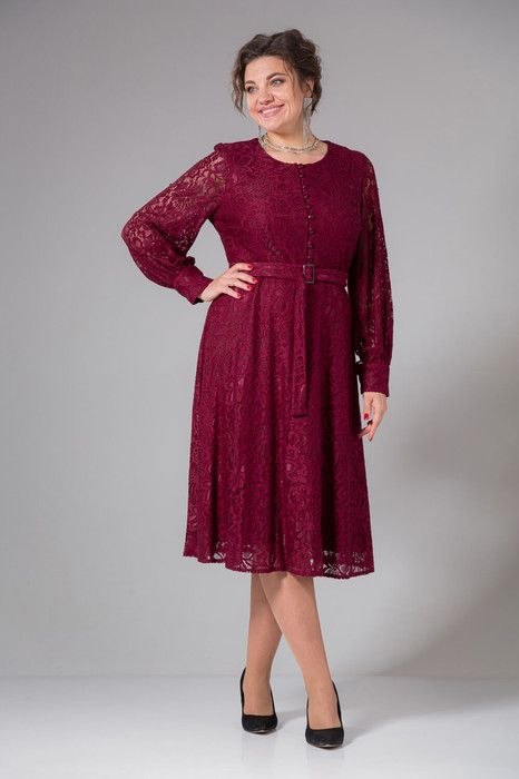 Платье женское, Икс-образного силуэта, приталенное сверху до талии и расклешенное к низу. Платье втачного покроя, с длинным рукавом, со сборкой понизу и на манжету с навесными петлями и пуговицами в цвет основной ткани. Платье выполнено из гипюровой ткани на подкладке, подкладка из плательной ткани. По переду расположена застежка с навесными петлями до талии. На верхних частях переда и спинки расположены талевые и нагрудные вытачки. Нижняя часть платья расширена. В левом боковом шве расположена потайная молния. К платью прилагается пояс с пряжкой.