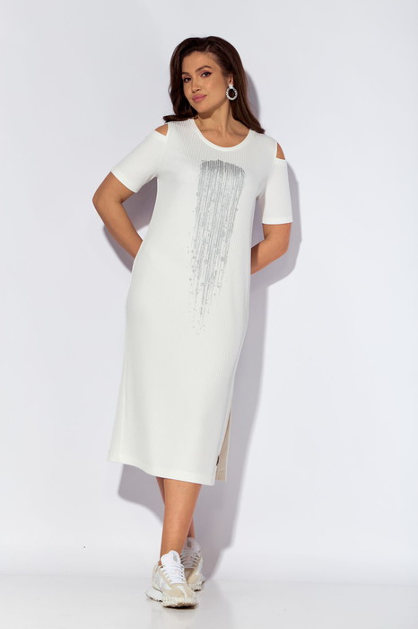 Платье женское, полуприлегающего силуэта, выполнено из трикотажного полотна (типа лапша) Рукав короткий, втачной, с открытым плечом. Вырез горловины круглой формы с подрезной бейкой. Перед задекорирован принтом. По боку, снизу разрез и нашивка. Спинка без особенностей.