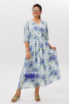 Платье женское, прямого силуэта, с втачным рукавом, длинной 3/4. Платье изготовлено из текстильной ткани с напылением и органзы с рисунком. Кокетки по переду и спинке, верхняя часть рукава и нижняя часть платья из огранзы. По боку разрез с отделочными планками. По низу рукава широкая манжета. Вырез горловины круглой формы. Застежка сзади на навесную петлю и пуговицу. Декором служит большой, съемный цветок из атласной ткани.