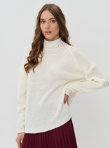 Джемпер в стиле прямой футболки, воротником-стойкой и короткими рукавами. Прямой силуэт, стандартная длина. Средняя плотность вязания, пластичная фактура. Выполнен гладью из мягкой полушерстяной пряжи. Шерсть в составе сохраняет тепло, а благодаря волокнам акрила изделие мягкое и дольше сохраняет форму.