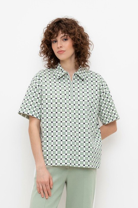 Джемпер поло с короткими рукавами и вязаным воротником из плотного набивного трикотажа интерлок с застежкой на молнию. Спущенное плечо придает изделию свободный силуэт.