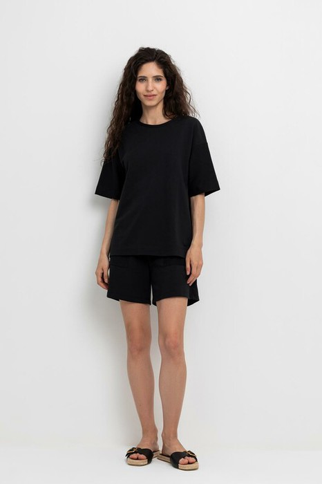 Женские шорты из футера на резинке с удобными карманами наизнанку. Пояс утягивается по ширине круглым шнуром. Низ обработан плоскими швами.