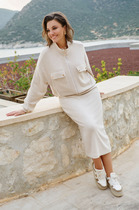 Тёплая трикотажная куртка на молнии с высоким воротником стойкой и широким поясом. Произведена из мягкого трикотажного футера трёхнитки. В составе 80% натурального хлопка и 20% полиэстера, при этом полиэстер ввязан внутрь по особой технологии и не соприкасается с кожей.
