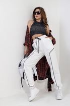 Пояс регулируется вязаным шнуром в тон брюк. Плотная фактура вязания согревает и сохраняет форму во время носки.