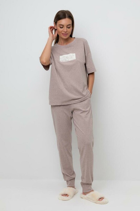 Легкий комплект для комфортного сна и отдыха из меланжевого трикотажа. Футболка с принтом и спущенной линией плеча комфортно садится по фигуре.  Брюки с эластичными манжетами с боковыми карманами. Круглый шнур позволяет регулировать посадку. Гладкий материал приятен к телу и позволяет коже дышать.