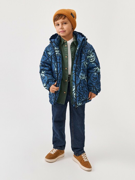 Детская утеплённая куртка в синем цвете для мальчика выполнена из мембранной ткани с водоотталкивающей пропиткой. Ткань с мембраной защищает не только от дождя и ветра снаружи, но и не покрывается влагой от испарений тела изнутри. Это делает её не только гидрофобной, но и дышащей. Подкладка изделия выполнена из стандартной подкладочной ткани. Вид утеплителя - синтепон, состав утеплителя 100% полиэстер (200г/м2). Рекомендованный температурный режим от +10 до - 10 градусов. Застёжка на молнию с внутренней ветрозащитной планкой предотвращает проникновение холода, а защита от защемления подбородка добавляет комфорт при ношении. Яркие принты в виде смайликов по всему изделию придают куртке яркий и оригинальный вид. Капюшон с утяжкой защищает от ветра во время прогулок на свежем воздухе. Спереди расположены два больших накладных кармана на кнопках, в которые можно удобно сложить мелочи или согреть руки. Низ рукавов с внутренней резинкой предотвращает задувание холодного воздуха. Модель выполнена в двух цветах: темно-сером и синем с принтами в виде смайликов, которые добавляют яркого акцента в наряд. Стилизуйте куртку со штанами и свитером для создания теплого и комфортного образа на прогулки на свежем воздухе или во время других активных занятий. Рост и размер модели на фото 110.