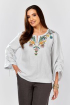 Блузка женская свободного покроя, удлиненная, с рубашечным рукавом на манжете по низу, по переду на уровне груди - накладной карман, застежка спереди на планку с пуговицами, воротник рубашечный на стойке, низ изделия фигурный, с закругленными разрезами по боковым швам.