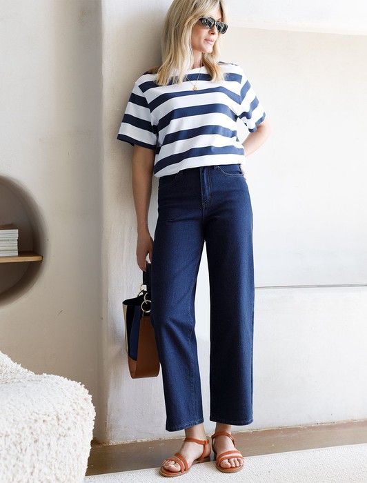 Состав: 85%Хлопок 13%Вис 2%ПУУкороченные прямые джинсы классического синего цвета. Выполнены из хлопка с добавлением эластана. Отлично держат форму почти не мнутся, не деформируется даже после множества стирок. Модель подходит абсолютно любому типу фигуры и вписывается в гардероб с любым верхом и обувью.