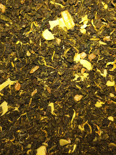 Китайский тигуань, миндаль резаный, цукаты персика, лепестки календулы.