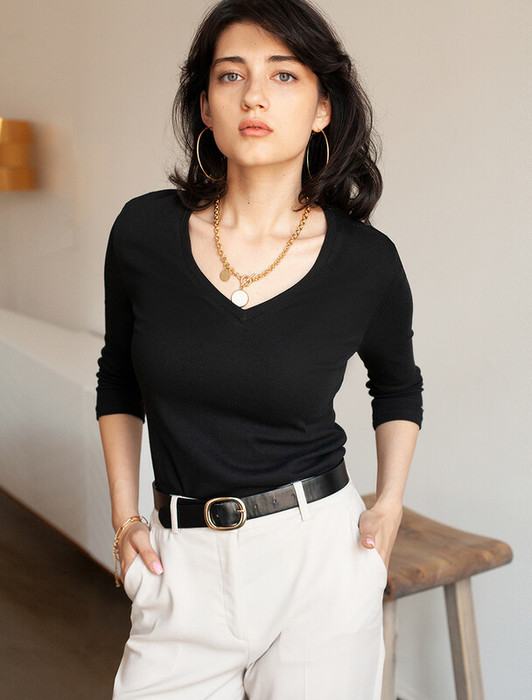 Черный джемпер с длинными рукавами и V-образным вырезом сшит из премиального хлопка. Однотонная хлопковая модель хорошо поддерживает комфортный для тела микроклимат. Благодаря вплетению эластановых волокон вещь хорошо сохраняет форму.