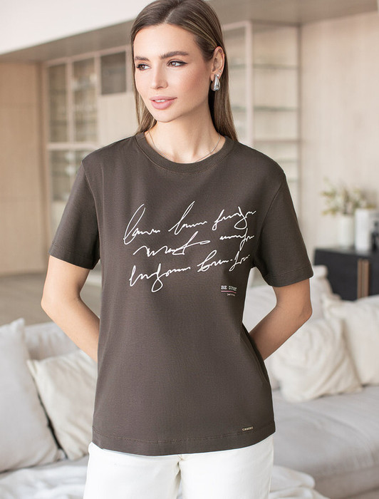 Совместные закупки Екатеринбург Женская одежда Футболки — Акция Vilatte Футболка из премиального хлопка с авторским принтом D49.983 кофе_