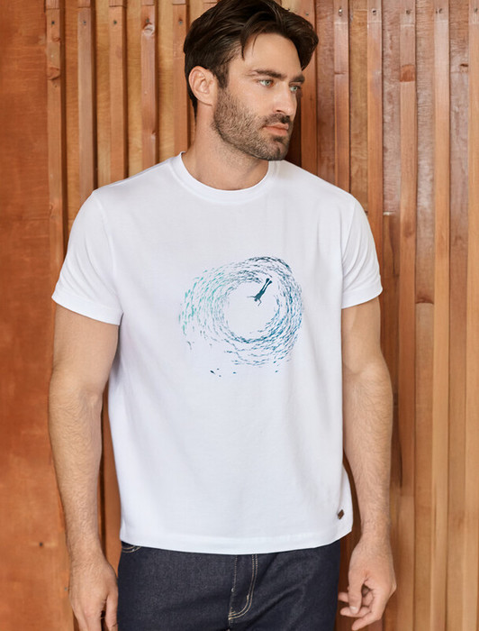 Футболка выполнена из премиального хлопка с эластаном. Авторский принт нанесен фактурными красками с устойчивым покрытием. Изделие комфортно сидит по фигуре, не сковывая движений. За счет среднего объема, хорошо подойдет как первый слой под пиджак, кардиган или бомбер. На рукаве нашивка из эко-кожи с логотипом бренда.