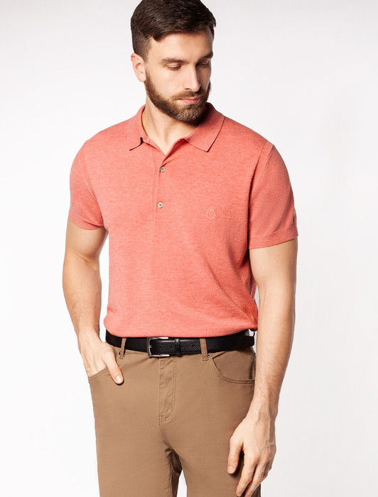 Поло терракотового цвета с эффектом меланж тонкой вязки из 100% хлопка. Отборные волокна хлопка исключительно мягкие, поэтому изделие легкое и шелковистое на ощупь. Идеальное решение для весны и лета. Офисного дресс-кода и повседневного образа. Модель дополнили вышитым логотипом бренда.