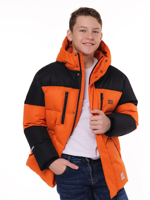 Объемная куртка для мальчика из двух цветов ткани на утеплителе из искусственного пуха. Подкладка – флис. Функциональные стежки. На куртке четыре кармана. Два нагрудных кармана и два нижних кармана. Нижние карманы закрыты клапанами уходящими в боковой шов. Все карманы на влагозащищенных молниях. Фронтальная молния закрыта ветрозащитной планкой, планка застегивается на потайные кнопки. Вся фурнитура лаконичного черного цвета. Внутренние трикотажные манжеты. Куртка дополнена бретелями «свободные руки», что очень актуально для мальчиков. Манжеты рукавов Капюшон несъемный. Регулировка капюшона по лицевому срезу выполнена с помощью шнура-резинки и фиксаторов. В верхней части левой полочки – термопринт черного цвета, нижней части Светоотражающий термопринт на спинке куртки и в нижней части левой полочки.