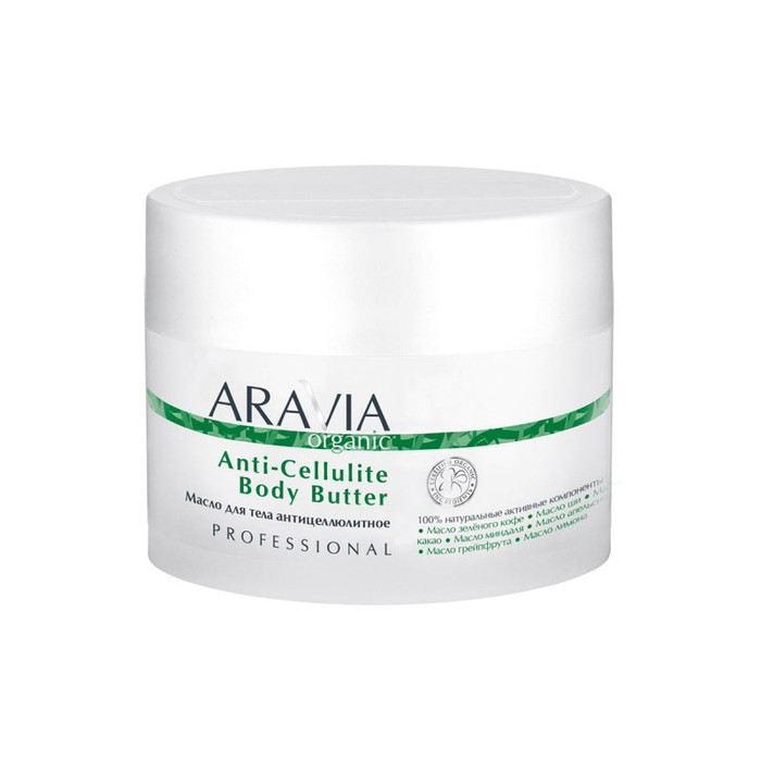 100% натуральное масло (баттер) для тела, без консервантов. Сочетание натуральных растительных масел предотвращает появление целлюлита, уменьшает его внешние проявления, а также быстро улучшает состояние кожного покрова, усиливает эластичность и плотность кожи. Входящее в состав масло зелёного кофе улучшает синтез коллагена, стимулирует биохимические процессы расщепления жира и уменьшения целлюлита. Повышает сопротивляемость кожи воздействию окружающей среды.Показания к применению: Предназначено для борьбы с целлюлитом и лифтингового ухода за кожей тела день за днём. Может применяться для массажа.Рекомендуется применение в домашних условиях.Состав: (INCI) Coffea arabica L. (green coffee) seed oil*, Glycine Soja (Soy Bean) Oil, Beeswax, Stearic Acid, Theobroma Cacao (Cocoa) Seed Butter*, Sunflower oil, Prunus Amygdalus Dulcis (Sweet Almond) Oil, Citrus Sinensis Oil, Lemon (Citrus limon) Essential Oil, Citrus Paradisi (*Органические биоактивные компоненты ECO-CERT).Применение: Небольшое количество масла разогреть в ладонях и нанести на чистую кожу тела. Тщательно распределить до впитывания массажными движениями. Использовать по мере необходимости.