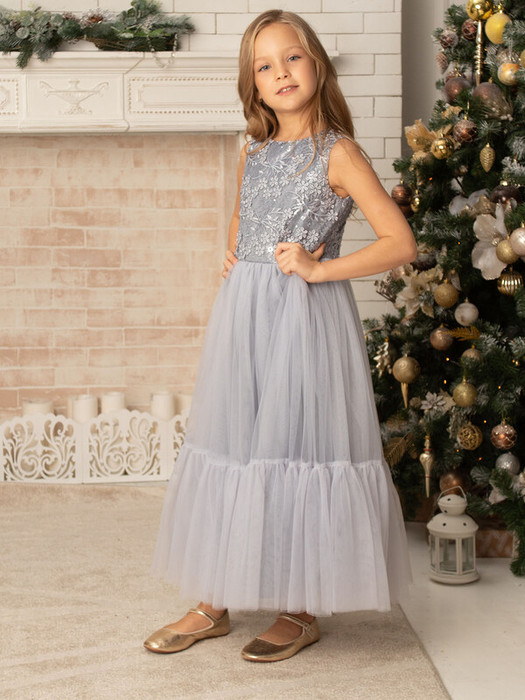 Нарядное серое длинное платье без рукавов с пышной юбкой из фатина. Гипюр на лифе, декоративный бант на поясе сзади. На спинке имеется поясок, чтобы дополнительно утянуть талию. Подкладка 100% хлопок. Праздничное детское платье можно использовать как новогоднее, вечернее, школьное, на выпускной.Характеристики:Ткань верха: Сатин - Полиэстер Гипюр - ПолиэстерСетка - ПолиэстерПодкладка 100% хлопокПроизводитель: batik