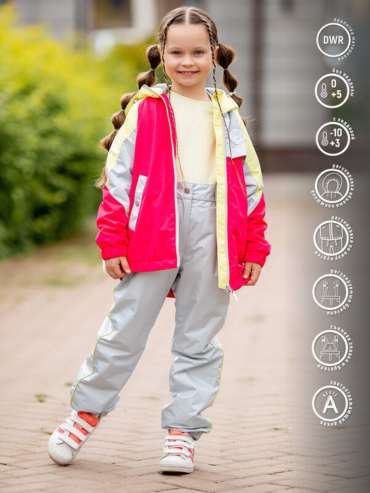 Стильный комплект для девочки Ника представлен в яркой розово-желтой расцветке. Смелое сочетание цветов в комплекте с серыми брюками-джоггерами отлично вписываются в городской стиль. Регулировка объема капюшона и по низу куртки защитит от ветра, а мембранная ткань с водоотталкивающей пропиткой от дождливой погоды. Комплект дополнен светоотражающим декором. Особенности: Водоотталкивающая пропитка материала DWR Регулировка объема капюшона Регулировка по низу куртки Регулируемые бретелиСъёмные бретели Светоотражающие элементы и декор Эластичные манжеты рукавовБоковые карманы на кнопкахНиз брюк на резинке Характеристики:Ткань верха: мембранаПодклад: микрофлис Утеплитель: слайтекс 100 - куртка, брюки - 60 Температурный режим от +5 до -10 СПроизводитель: batik