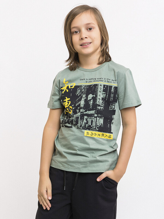 Футболка с коротким рукавом для детей из натурального хлопка. Расцветка хаки, стильный принт спереди. Классический круглый вырез – удобная посадка, не натирает шею. Футболка идеальна для садика, прогулок и активных игр. Легко комбинируется с любой детской одеждой: брюками, шортами, джинсами.Характеристики:Ткань: 100% хлопокПроизводитель: batik