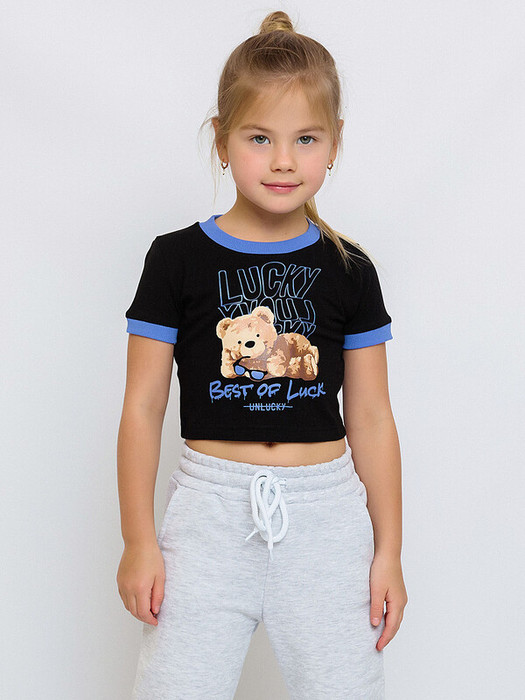 Футболка укороченная для девочки с коротким рукавом. Контрастная отделка воротника и рукавов. Спереди принт в виде мишки и надписей.Характеристики:Ткань: Супрем пенье 92% хлопок 8% эластанПроизводитель: batik