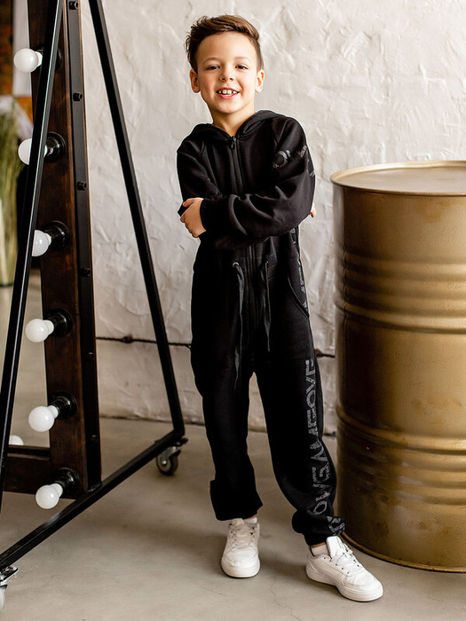 Комбинезон Флай из футера детский на молнии. Комбинезон с капюшоном выполнен из плотного футера в черной расцветке для девочек и мальчиков. Манжеты рукавов и низ брючин на резинке. Есть карманы по бокам. Шнурок для утяжки по талии. Надписи по бокам и на рукавах.