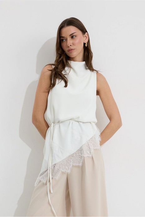 Описание Ассиметричная блузка полуприлегающего силуэта из струящейся ткани. Горловина цельнокроеная. По низу декоративная тесьма( кружево). По низу в боковом шве разрез. Пояс-шнурок из основной ткани идет в комплект.