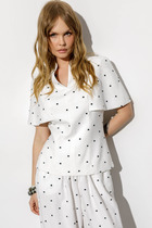 Блуза женская свободного силуэта с фигурным низом. Вырез горловины круглый. Низ переда собран на пояс из основной ткани. Рукав втачной на резинке.